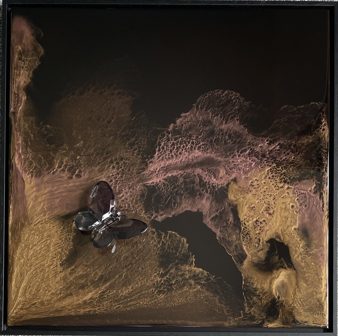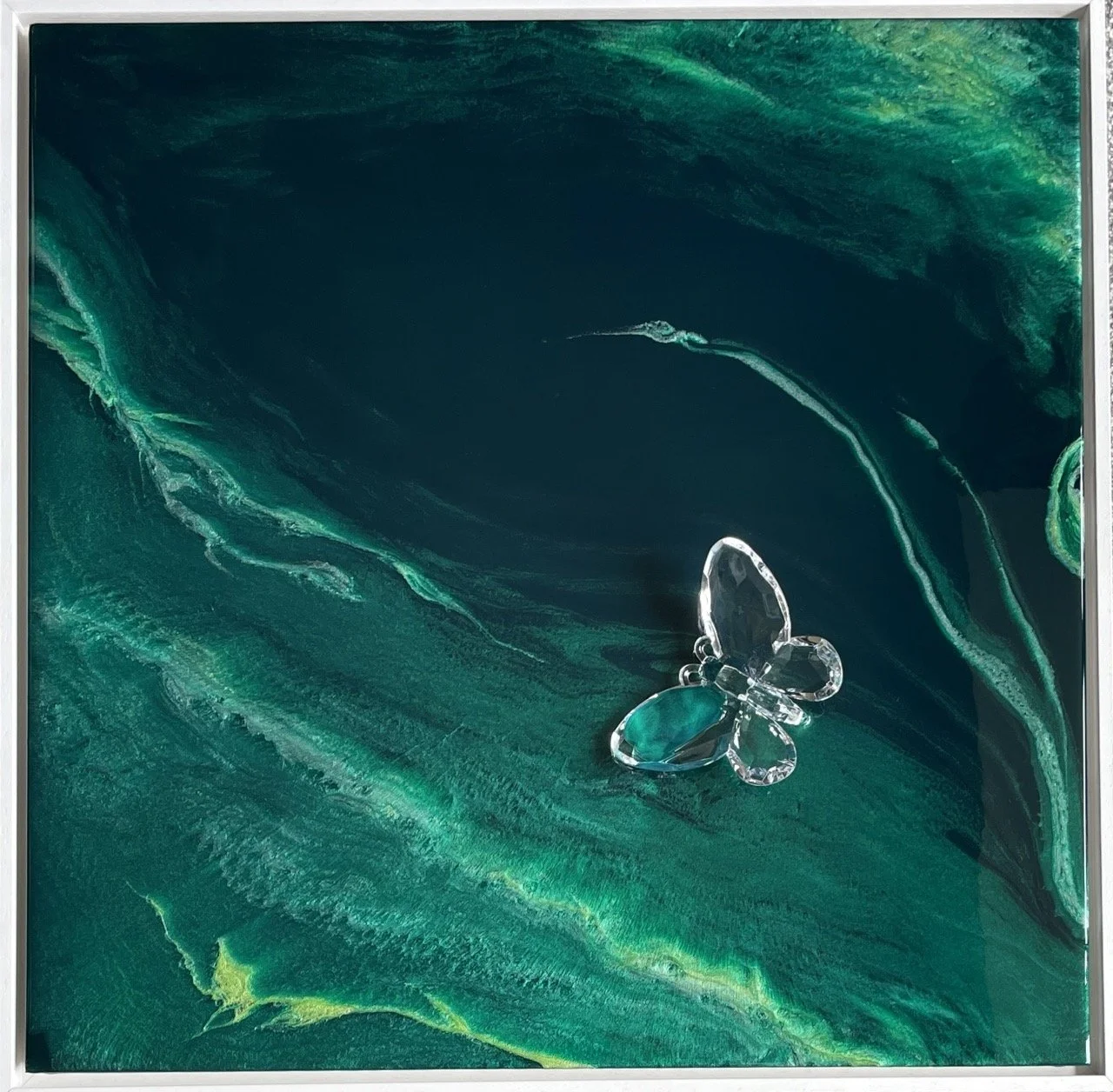 Resin, Pigments and Acrylic on a Wood Panel. Acrylic Butterfly. Framed in a white wooden float frame..